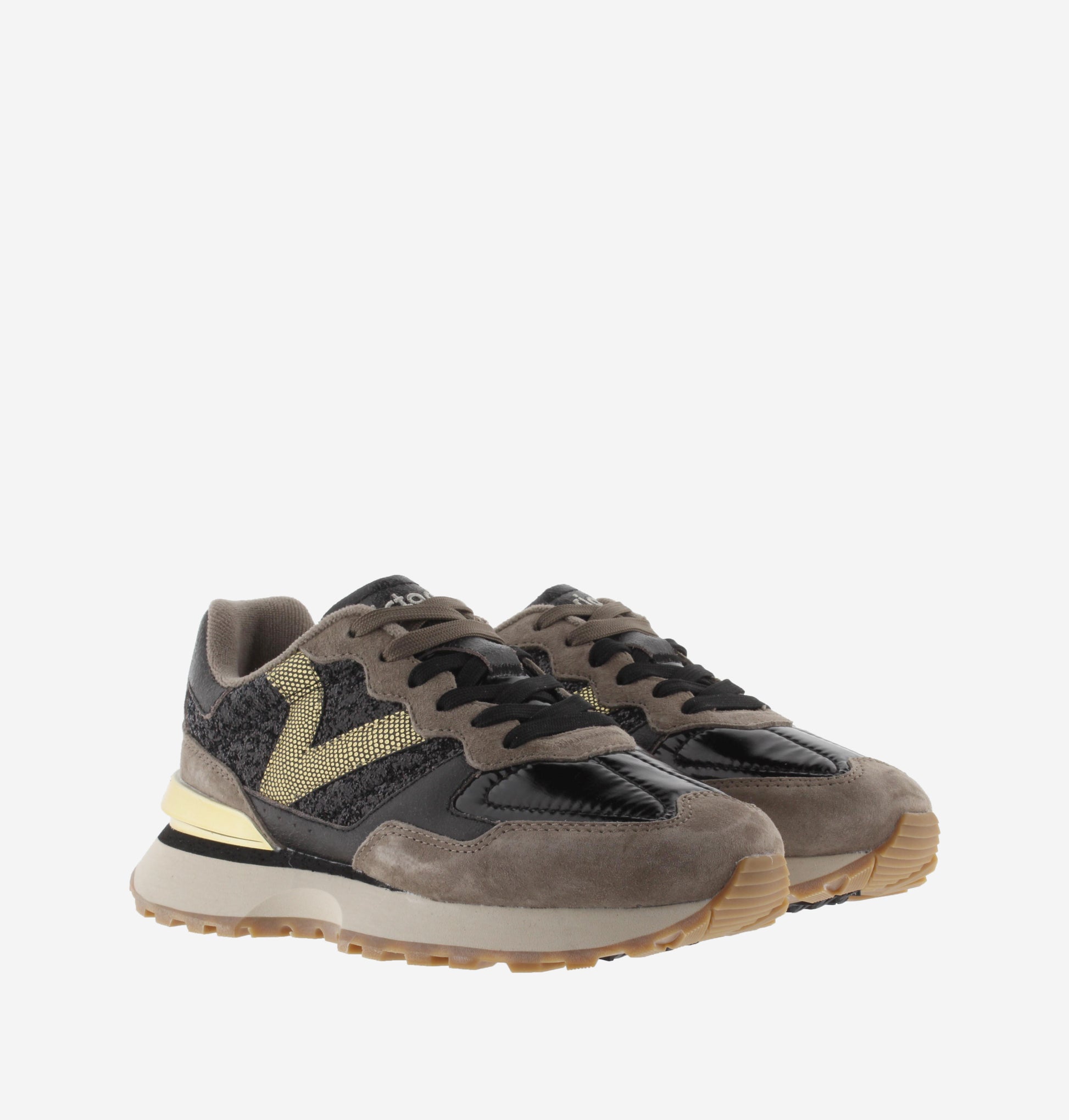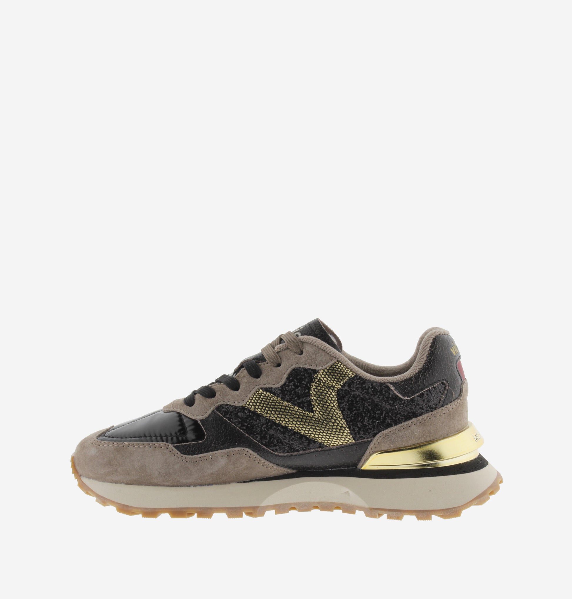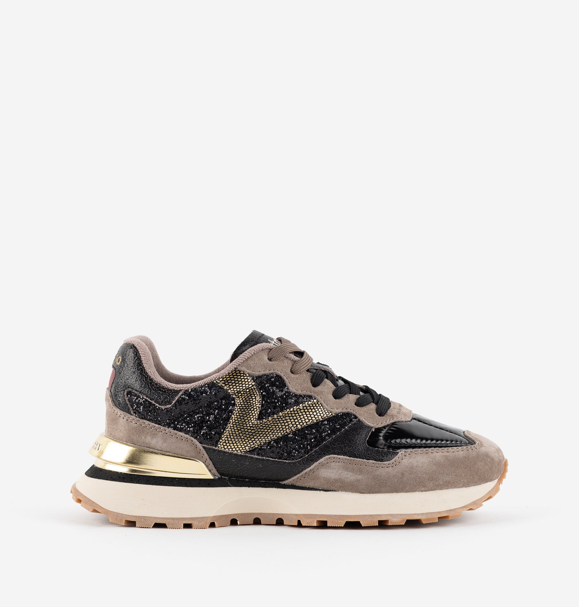 Sporty sneakers in runners' style from the Spanish label VICTORIA. The RUSH-GLAM women's sneakers from the 1985 collection are the perfect combination of urban style and comfort. Crafted from coarse metallic glitter with suede-finish cowhide suede inserts and vintage-effect leather. The rubber sole guarantees optimal grip thanks to its ergonomic design, while the foam-based insole provides light cushioning for a comfortable stride.